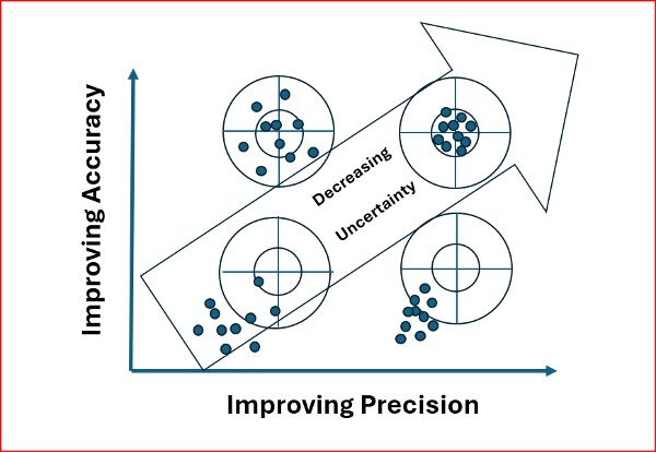 As the diagram shows, simply repeating observations can give the appearance of good precision, but it does not guarantee accuracy. The result can be high precision with low accuracy — and therefore a large remaining uncertainty.