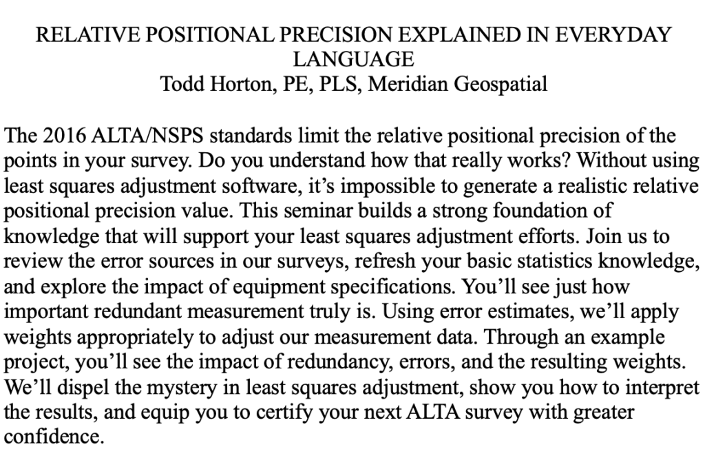 Horton also gave a very good session on a very difficult subject, that is ALTA/NSPS “Relative Positional Precision (RPP).”